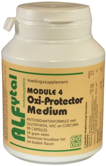 Alfytal Oxi-Protector Medium Capsules bevat de vitamines C en E en de mineralen zink en selenium die bijdragen bij tot de bescherming van cellen tegen oxidatieve stress. Tevens bevat het ter aanvulling hierop een aantal andere nuttige ingrediënten zoals glutathion,