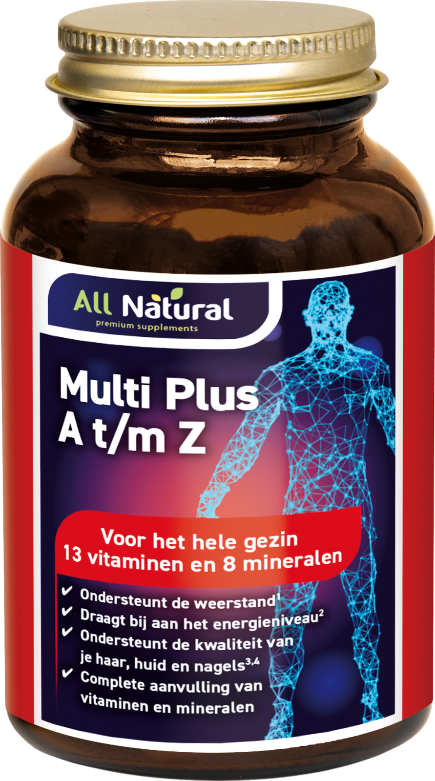 All Natural Multi Plus A-Z Tabletten is een multivitamine voor het hele gezin met 13 vitaminen en 8 mineralen. Vitamine C ondersteunt de weerstand. Vitamine B12 activeert uw natuurlijke energie in het lichaam. Zink en Seleen ondersteunen de kwaliteit van uw haar, huid en