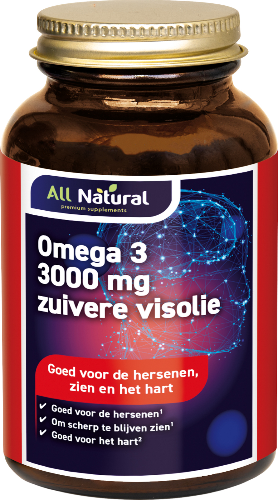 All Natural Omega-3 3000 mg Zuivere Visolie is een visoliepreparaat met een gezuiverde, geconcentreerde, natuurlijke visolie. EPA en DHA ondersteunen de werking van het hart bij een dagdosering van minimaal 250 mg van beide omega-3 vetzuren. DHA draagt bij aan de