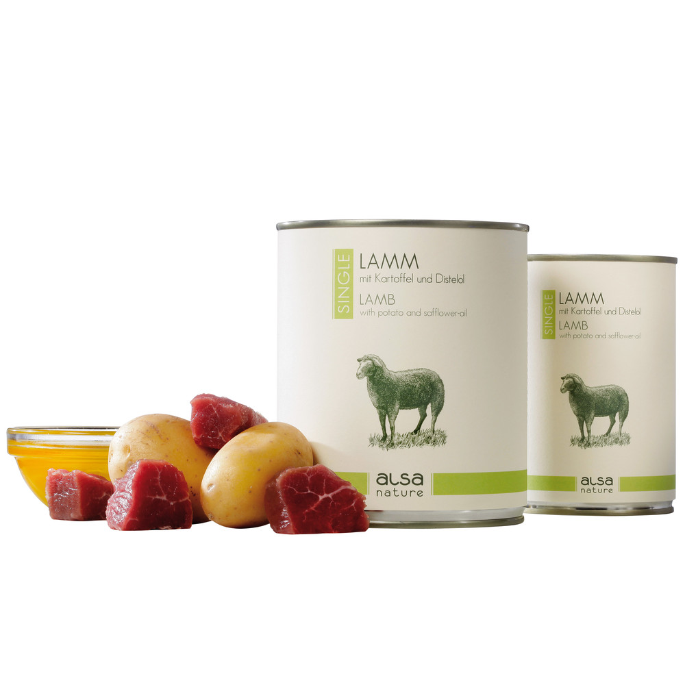 alsa-nature SINGLE Lam met aardappel – Zelfs met een gevoelige maag of allergieën hoeft uw hond smakelijke voeding niet te missen: lam is zeer smakelijk en is ook voor gevoelige honden zeer goed te verdragen. Deze volledige evenwichtige voeding bevat geen andere soorten vlees en uitsluitend aardappelen als koolhydraten leverancier. Koudgeperste distelolie met alle essentiële vitaminen en mineralen maken deze heerlijke samenstelling af.