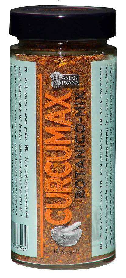 Aman Prana Botanico Mix Curcuma met een mix van kurkuma en sumak. Over curcuma zijn al heel wat boeken geschreven. Het is naast een smaakmaker ook nog eens een mooie kleurstof. Het is kurkuma die kerrie/curry-poeder zo geel maakt en ook uw gerechten kleurt. In de Ayurveda