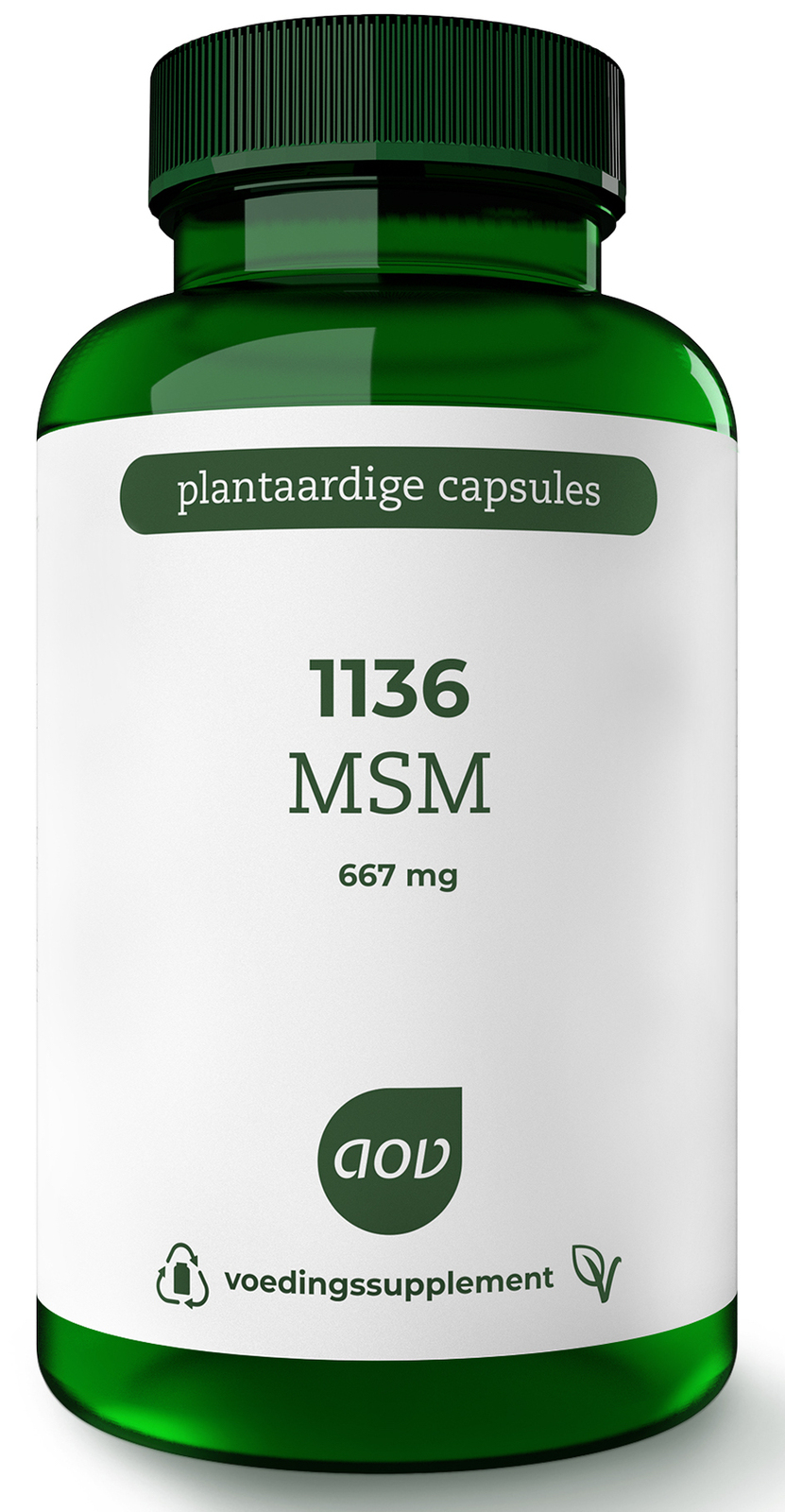 AOV 1136 Msm is de afkorting van methylsulfonylmethaan, een organische zwavelverbinding die bestaat uit zwavel en methylgroepen. MSM komt van nature voor in groente en fruit. Flacons van 100% gerecycled plastic (rPET). De AOV supplementen zijn vanaf nu terug te vinden in