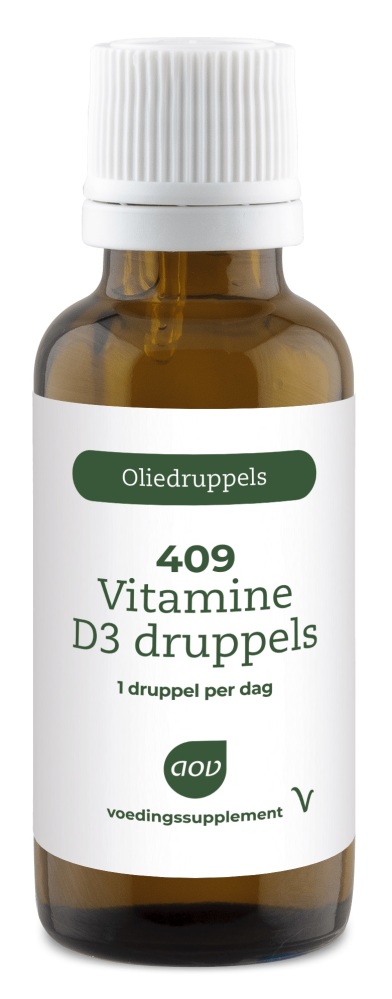 AOV 409 Vitamine D3 Druppels (15 ml) is een voedingssupplement dat eenvoudig te doseren en in te nemen is. Vitamine D3 verhoogt de calciumopname in de botten, helpt bij het behouden van sterke botten en tanden en ondersteunt het immuunsysteem. Vitamine D is een in vet