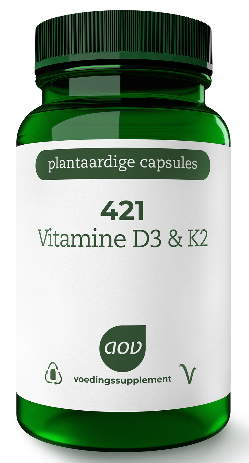 AOV 421 Vitamine D3 & K2 Vegacaps (60 stuks) is een voedingssupplement en bevatten de natuurlijke vorm van vitamine D en K. Flacons van 100% gerecycled plastic (rPET). De AOV supplementen zijn vanaf nu terug te vinden in een duurzamere verpakking. Door te kiezen voor rPET