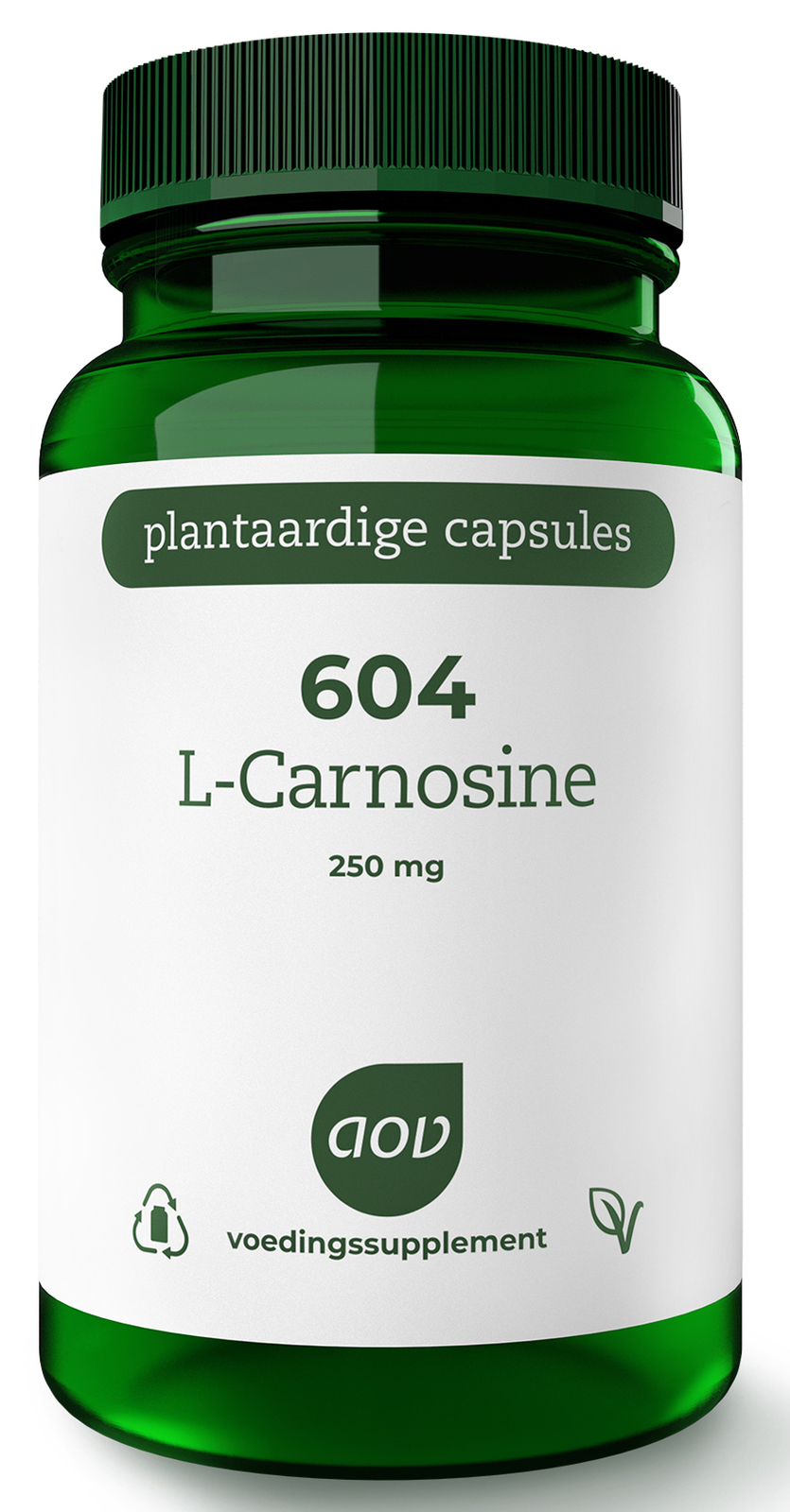 AOV 604 L Carnosine 250mg bevat 1000 mg l-carnosine per dagdosering (4 vegacaps) en is geschikt voor vegetariërs en veganisten. L-carnosine (bèta-alanyl-L-histidine) is een dipeptide, een molecuul van twee aminozuren (bèta-alanine en L-histidine) die via een enkele