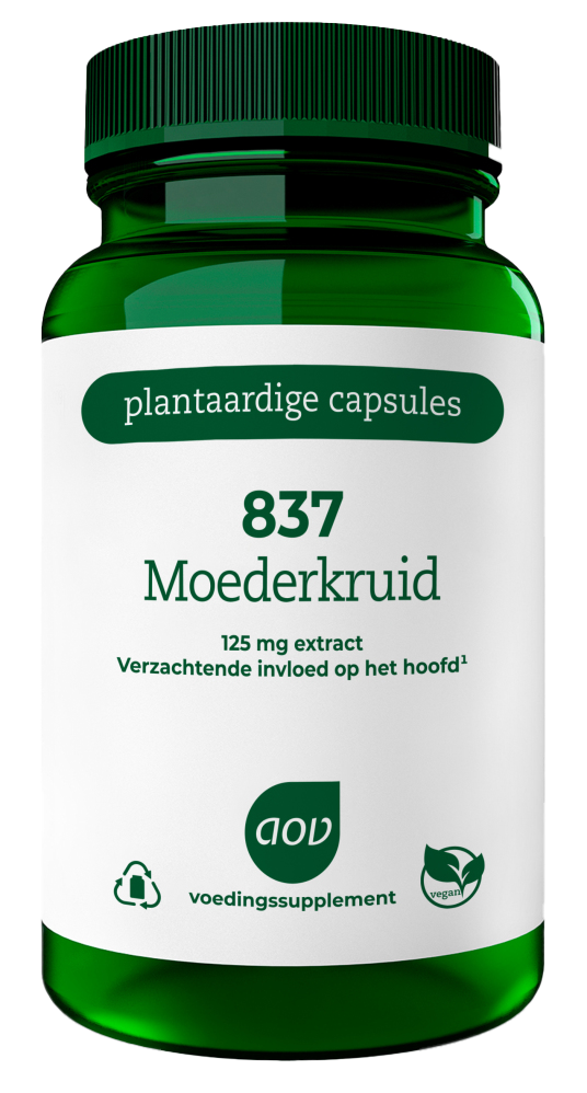 AOV 837 Moederkruid Capsules op basis van Moederkruid hebben een verzachtende invloed op het hoofd.* Dit supplement bevat 125 mg Tanacetum parthenium-extract, beter bekend als moederkruid. Deze plant, die in Nederland in het wild groeit, komt vooral voor langs bermen en op