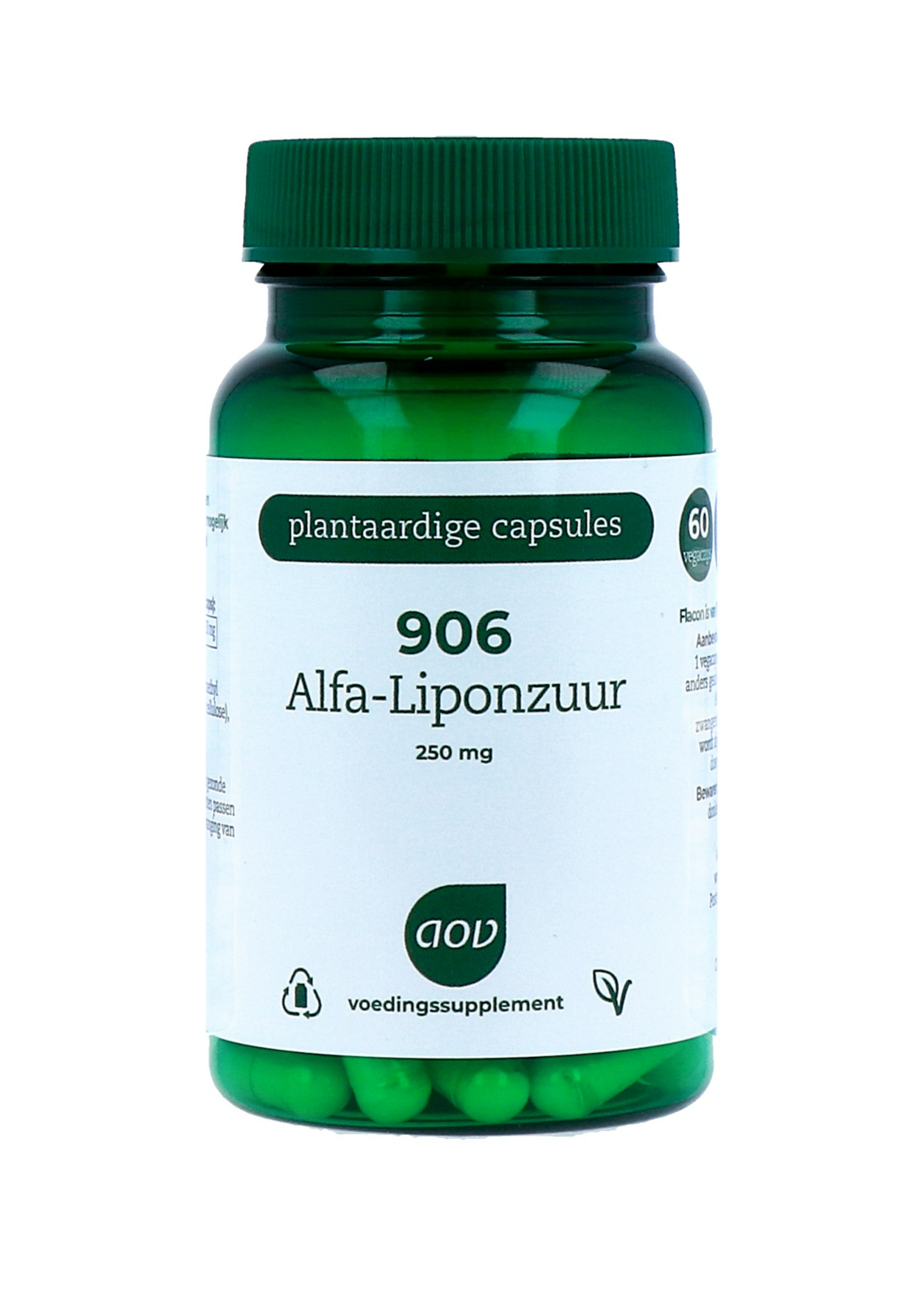AOV 906 Alfa Liponzuur (60 stuks) bevat 250 mg alfa-liponzuur per vegacaps. Alfa-liponzuur is een zwavelhoudend vetzuur en komt in zeer geringe hoeveelheden voor in voeding, bijvoorbeeld in broccoli en spinazie. Geschikt voor vegetariërs en veganistenFlacons van 100%