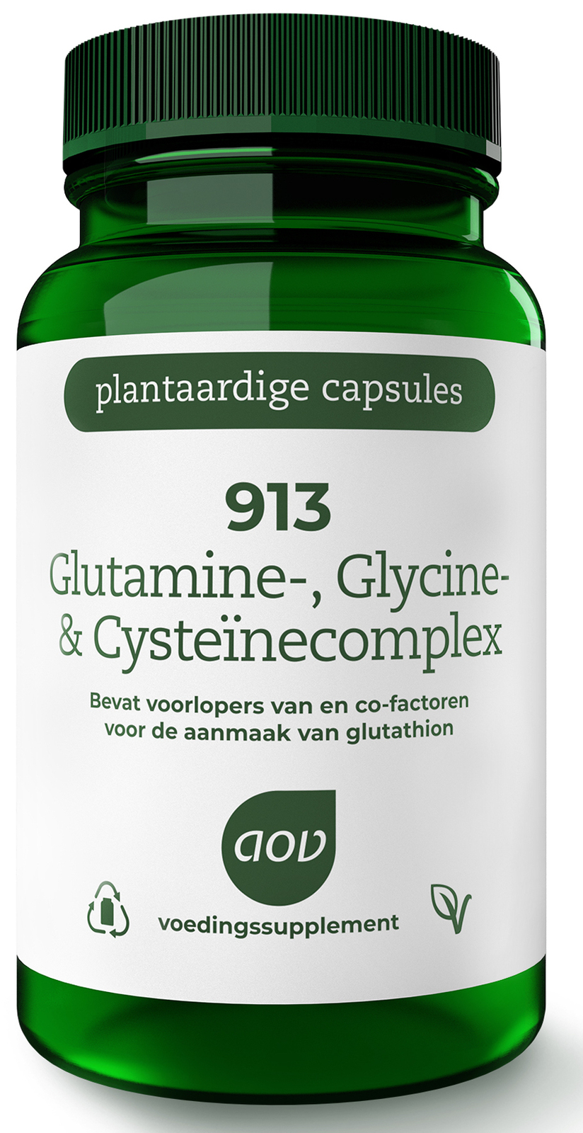 AOV 913 Glutamine-, Glycine- & Cysteïnecomplex bevat cysteïne, glycine, glutaminezuur en verschillende co-factoren voor de aanmaak van glutathion.Geschikt voor vegetariërs en veganistenFlacons van 100% gerecycled plastic (rPET). De AOV supplementen zijn vanaf nu terug te