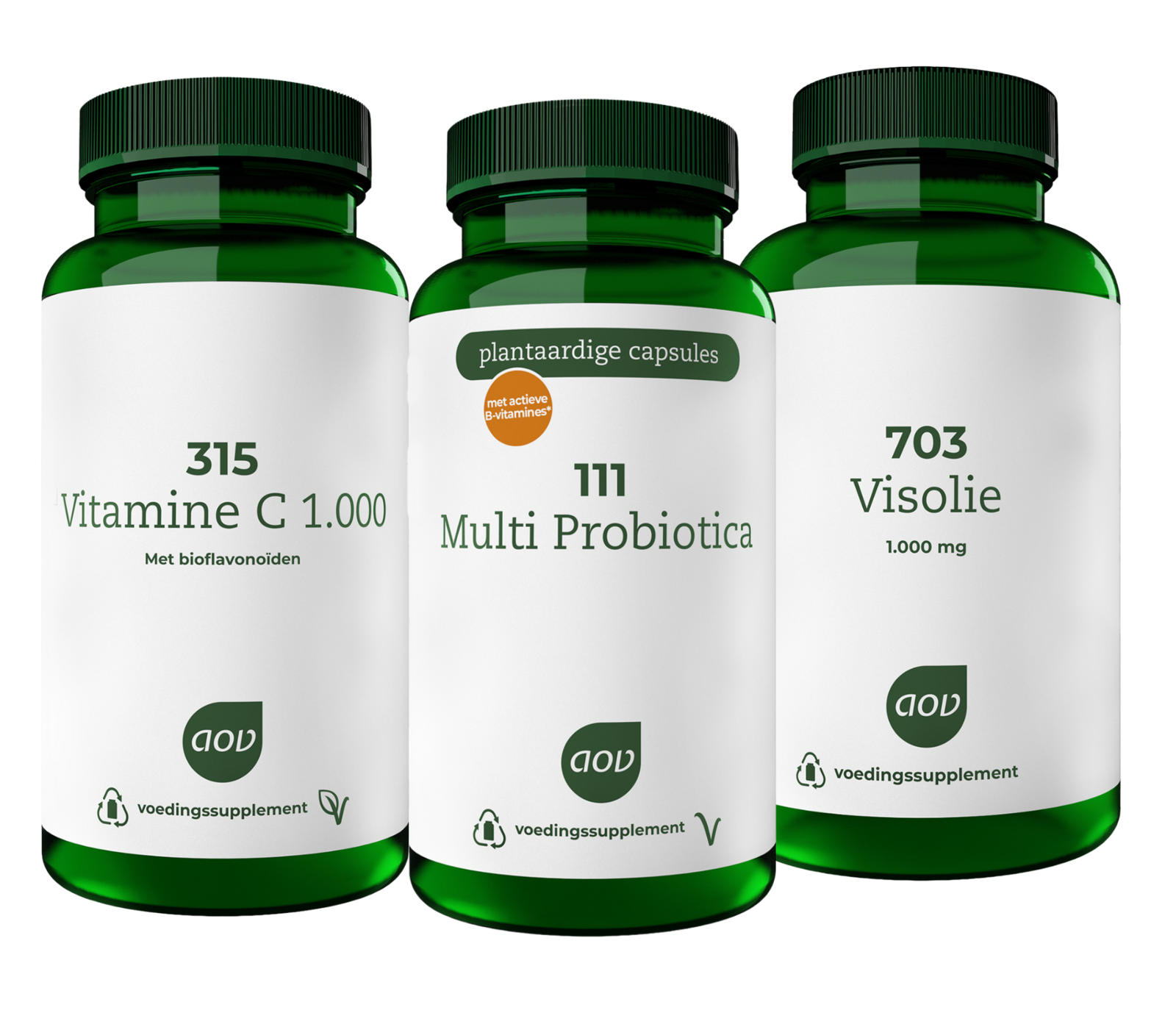 AOV Basis Bundel is een samengestelde bundel met uw dagelijkse supplementen ter aanvulling op uw voeding in één bundel: een uitgebalanceerde multi, vitamine C en essentiële omega-3 vetzuren uit visolie.AOV Basis Bundel bestaat uit:1x AOV 111 Multi Probiotica 60VCP – 111