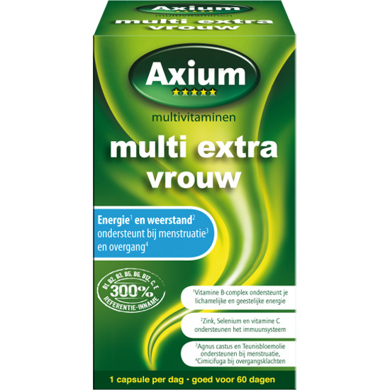 Axium Multi Extra Vrouw is een multivitamine speciaal samengesteld voor de vrouw. Het bevat een groot aantal hooggedoseerde vitaminen, aangevuld met mineralen en natuurlijke bestanddelen voor extra energie (B-complex, ijzer, groene thee) en een goede weerstand (onder andere vitamine C, D, selenium en zink). Het uitgebreide vitamine B-complex ondersteunt je lichamelijke en geestelijke energie. De hoge doses antioxidant vitaminen C en E en selenium helpen je het hele jaar fit en gezond te blijven. Vitamine C en D ondersteunen bij de opbouw en behoud van sterke botten en tanden. Agnus castus helpt bij wisselende stemmingen tijdens de menstruatie en overgang.DoseringEén capsule met wat water innemen, bij voorkeur tijdens of na de maaltijd. De aanbevolen dagdosering niet overschrijden.WaarschuwingNiet gebruiken tijdens de zwangerschap en borstvoeding. Wanneer je medicijnen gebruikt, wordt geadviseerd eerst een arts te raadplegen.Een voedingssupplement is geen vervanging van een gevarieerde voeding en een gezonde leefstijl.