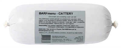 BARFmenu’s worden gemaakt van uitsluitend vers rauw vlees, verse organen, verse vleesbotten van superieure kwaliteit.BARFmenu is een officieel geregistreerde merknaam. Het is een gegarandeerd kwaliteitsproduct waarbij de ingrediënten met uiterste zorg worden ingekocht, samengesteld en onder ideale omstandigheden verwerkt wat garant staat voor een constante hoge kwaliteit. Het versvoer is van dusdanig hoge kwaliteit dat het zelfs voor menselijke consumptie geschikt is. (dus geen afvalvlees).- Bevat van nature een hoog gehalte aan natuurlijke vitaminen en mineralen.- Zonder geur-, kleur-, smaakstoffen en/of conserveringsmiddelen.- Glutenvrij (bevat geen rijst of granen).Aanvullend diervoeder voor katten.Samenstelling: Rundvlees, kippenvlees, konijnenvlees, makreel, kippenbotten, konijnenbotten, runderorganen en eendenorganen. Verrijkt met dierlijke vezels, zalmolie, vitaminen en mineralen.Analytische bestanddelen: Vocht 64,26%, As 2,78%, Eiwit 16,53%, Vet 15,25%, Celstof 0,31%, Calcium 0,90%, Fosfor 0,57% Ca:P 1,58Energie (kcal/100g): 203,40Nutritionele toevoegingsmiddelen (/kg): Calcium 0,03 g, Fosfor 0,18 g, Ijzer – Sulfate, monohydrate 8,0 mg, Zink – Sulfate, monohydrate 20 mg, Mangaan – Oxide 5,0 mg, Koper – Sulfate, pentahydrate 3,0 mg, Jodium – Calcium iodate anhydrate 0,7 mg, Selenium – Sodium selenite 0,1 mg, Lysine 0,22 g, Taurine 0,50 g, Vitamine A – Retinylacetate 3000 IU, Vitamine D3 700 IU, Vitamine E – a-tocopheryl-acetate 100 IUVoedingsadvies per kg lichaamsgewicht: volwassen 35 gram, kitten 70 gramInhoud: 500 gram