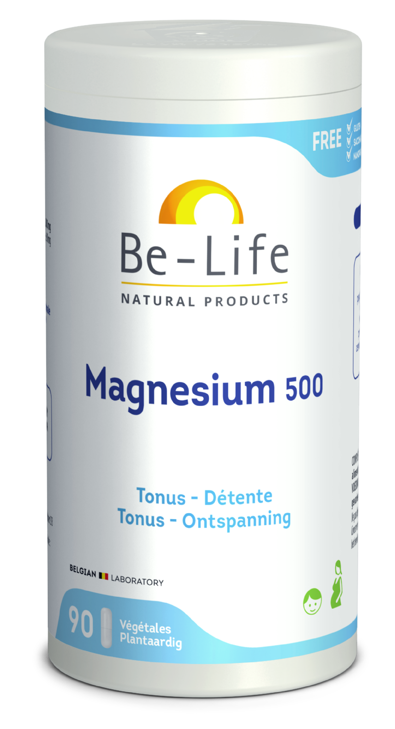 Be-Llife Magnesium 500 is een hoogwaardig voedingssupplement met magnesium. Magnesium is een essentieel mineraal dat onder andere bijdraagt aan een goede werking van het zenuwstelsel.Magnesium draagt bij tot:- de vermindering van vermoeidheid en moeheid;- de werking van het