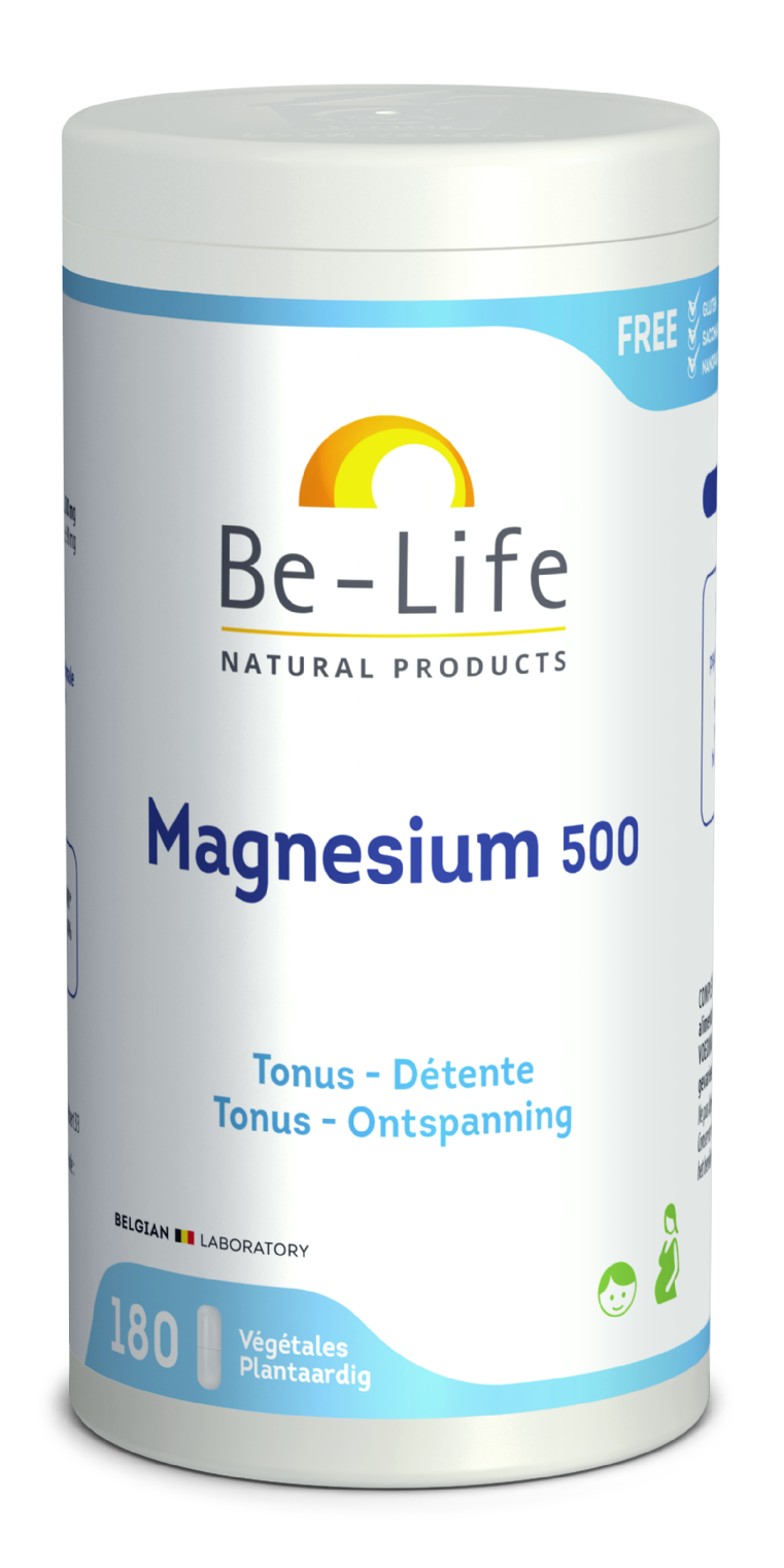 Be-Llife Magnesium 500 is een hoogwaardig voedingssupplement met magnesium. Magnesium is een essentieel mineraal dat onder andere bijdraagt aan een goede werking van het zenuwstelsel.Magnesium draagt bij tot:- de vermindering van vermoeidheid en moeheid;- de werking van het
