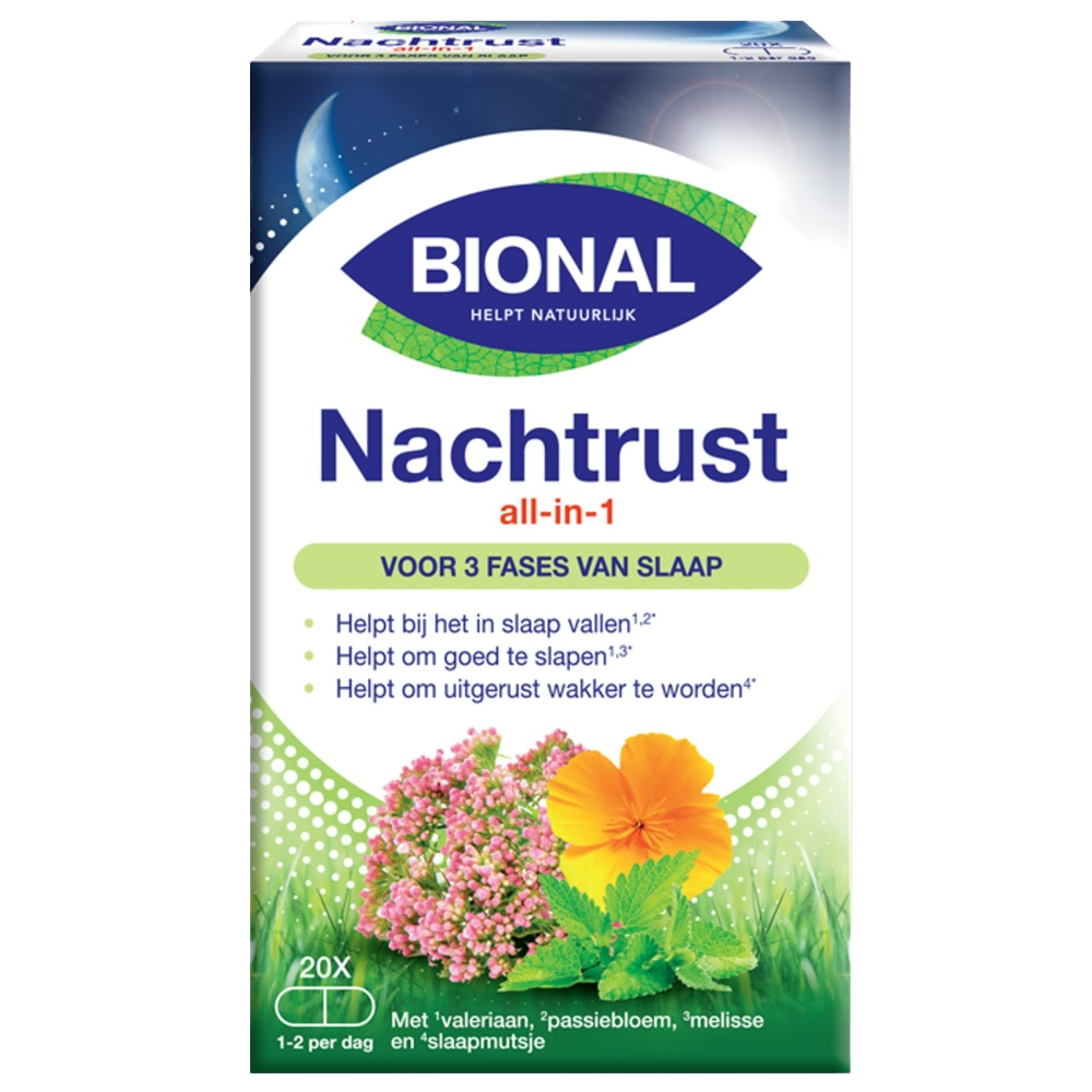 Bional Nachtrust All-In-1 Capsules (20 stuks) bevat een combinatie van slaapmutsje, valeriaan, hop, melisse en passiebloem. Bional Nachtrust All-In-1 Capsules:Valeriaan helpt een natuurlijke slaap te behouden*Hop helpt de spijsvertering te ondersteunen*Melisse draagt bij