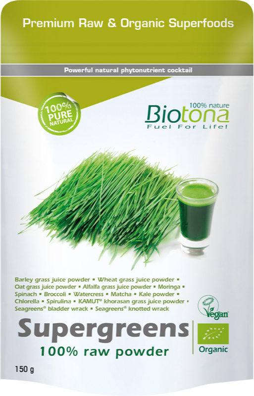 Biotona Supergreens Raw Poeder is een aanvullende combinatie boordevol biologische en groene rauwe superfoods. Deze samenstelling is samengesteld uit 100% pure bronnen van groen voedsel, elk met hun eigen unieke assortiment fytonutriënten, van nature aanwezig. Dit poeder