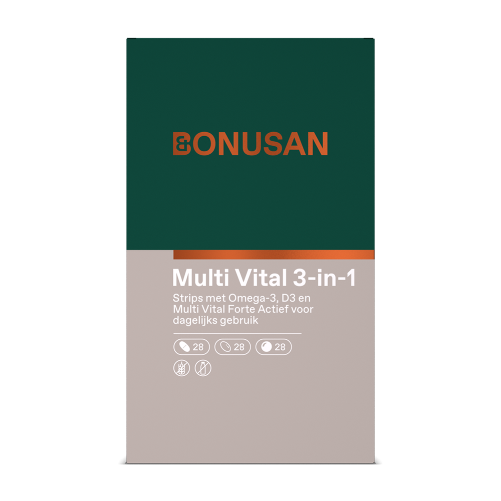 Bonusan Multi Vital 3-in-1 Tabletten (84 stuks) combineert de drie essentiële supplementen in een praktische maandverpakking. Hierdoor ontvangt u dagelijks alle benodigde vitaminen, mineralen en omega-3-vetzuren in een vorm die makkelijk door het lichaam wordt