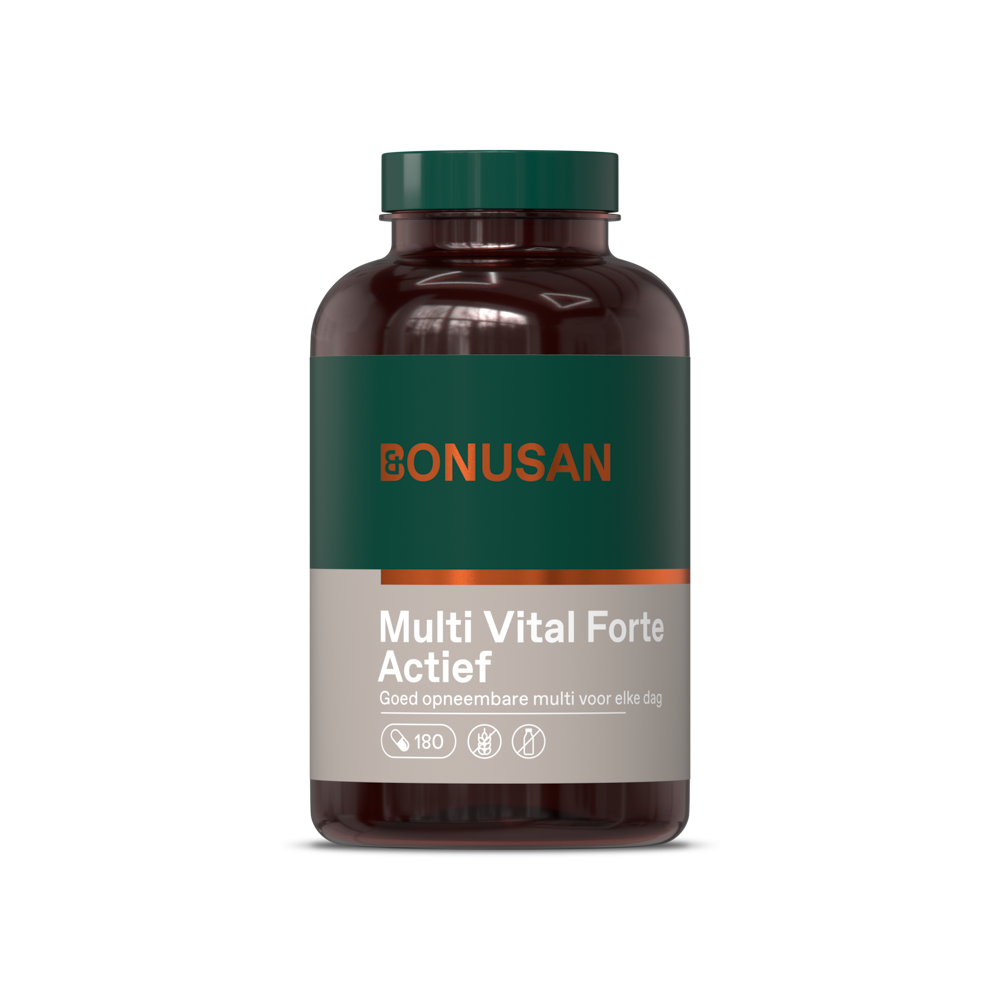 Bonusan Multi Vital Forte Actief (180 stuks) is een complete multi met alle vitaminen en een breed spectrum mineralen voor dagelijks gebruik. Vitamine C, B6, B12 en foliumzuur zijn in de actieve vorm, voor een extra hoge biologische beschikbaarheid.Bonusan Multi Vital Forte
