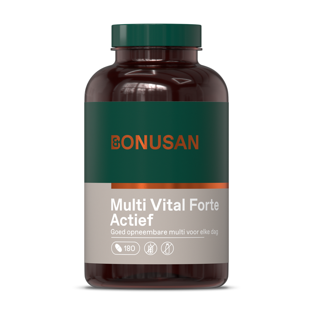 Bonusan Multi Vital Forte Actief tabletten (180 stuks) is een complete multi met alle vitaminen en een breed spectrum mineralen voor dagelijks gebruik. Vitamine C, B6, B12 en foliumzuur zijn in de actieve vorm, voor een extra hoge biologische beschikbaarheid.Bonusan Multi