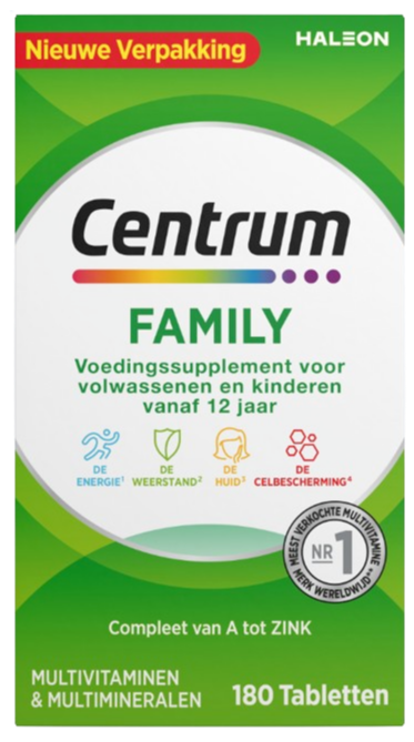 Centrum Family Multivitaminen Tabletten (180st) heeft u een complete multivitamine mineralen supplement in handen. De formule bevat alle belangrijke vitaminen en mineralen om de voedingsbehoeften voor volwassenen en kinderen vanaf 12 jaar te ondersteunen.Centrum Family