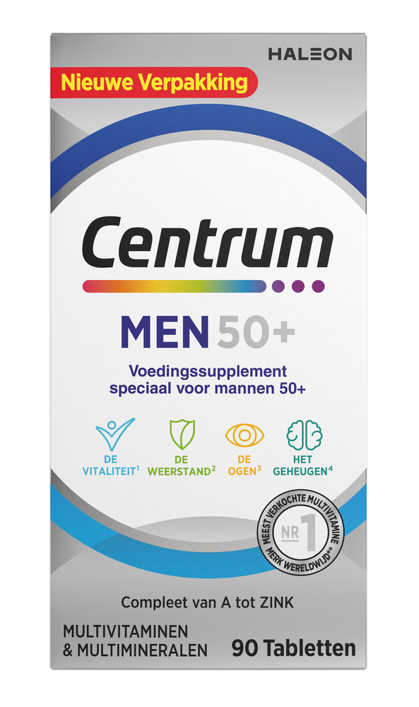 Centrum Men 50+ Multivitaminen is een compleet multivitamine mineralen supplement. De formule is speciaal ontwikkeld voor mannen van 50 jaar en ouder en is ondersteunend aan de voedingsbehoeften van deze mannen. Naar mate we ouder worden treedt er een verandering in de