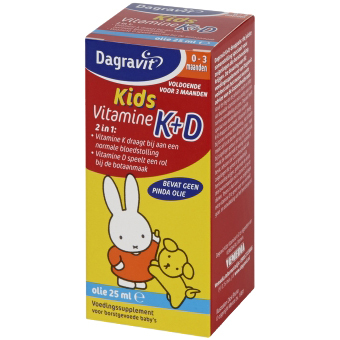 Dagravit Kids Nijntje Vitamine K+D druppels is een complete formule speciaal voor zuigelingen die borstvoeding krijgen. Vanaf de dag van de geboorte heeft je baby van bepaalde vitaminen extra nodig voor een normale ontwikkeling en groei. Vitamine K draagt bij aan een goed verloop van de bloedstolling en vitamine D speelt een rol bij de botaanmaak. De dosering voldoet aan het meest recente advies van de Gezondheidsraad. Geschikt voor baby’s van nul tot drie maanden.GebruikDe druppels toedienen met behulp van een theelepeltje of op de tepel van de moeder druppelen. Vermijd bij toediening contact van het flesje met de mond of etenswaren, omdat speeksel of etenswaren de inhoud van het flesje kunnen verontreinigen.DoseringVanaf de tweede week na de geboorte tot en met twaalf weken: vijf druppels per dag voor zuigelingen die borstvoeding krijgen. Deze dagdosering wordt door de Gezondheidsraad aanbevolen aan zuigelingen die borstvoeding krijgen vanaf de tweede week na de geboorte tot en met twaalf weken. Vanaf twaalf weken tot vier jaar blijft een dagelijks supplement van 10 µg vitamine D nodig.Een voedingssupplement is geen vervanging van een gevarieerde voeding en een gezonde leefstijl.