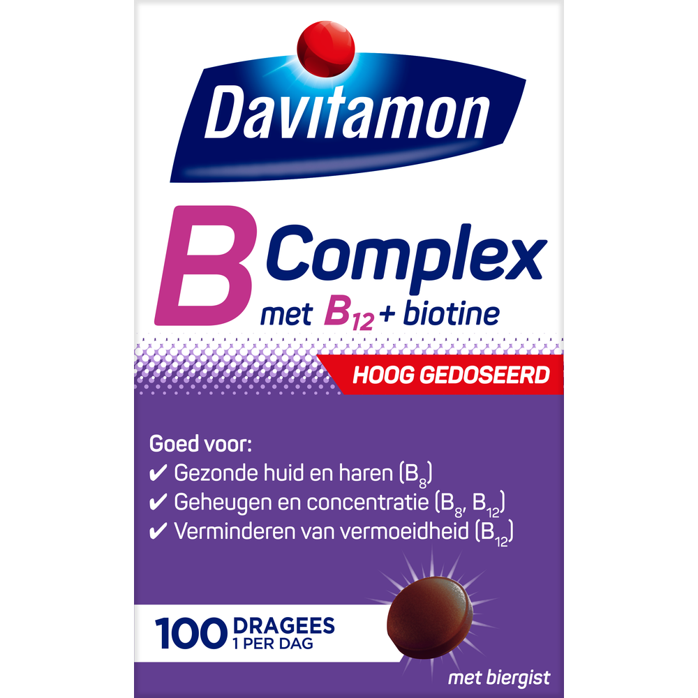 Davitamon B-Complex Forte Dragees bevatten een combinatie van biergist en acht verschillende vitamines uit het B-complex, die allemaal hun eigen belangrijke functies hebben in het lichaam. Met Davitamon B-Complex Forte Dragees geeft u uw lichaam een extra boost.
