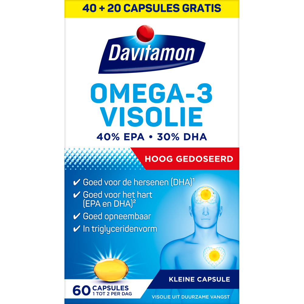 Davitamon Compleet Omega 3 Visolie is een voedingssupplement dat uw lichaam voorziet van belangrijke Omega 3 vetzuren. Deze vetzuren zijn essentieel voor een goede werking van uw hersenen, hart en gezichtsvermogen. Het product is geschikt voor volwassenen vanaf 6 jaar en