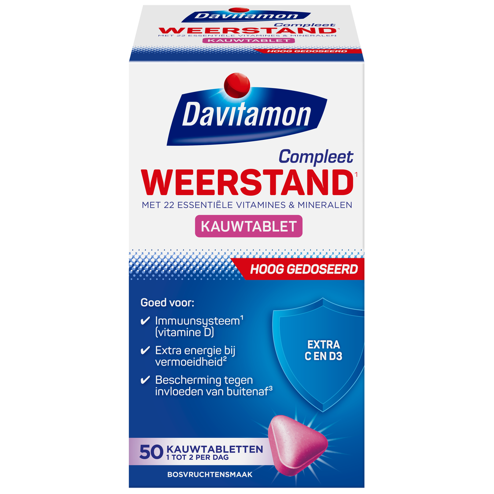 Davitamon Compleet Weerstand Hoog Gedoseerd Kauwtabletten ondersteunt de weerstand en bevat alle belangrijke vitamines en mineralen voor een gezond immuunsysteem. Deze hoog gedoseerde kauwtabletten zijn speciaal ontwikkeld voor volwassenen en geven extra ondersteuning