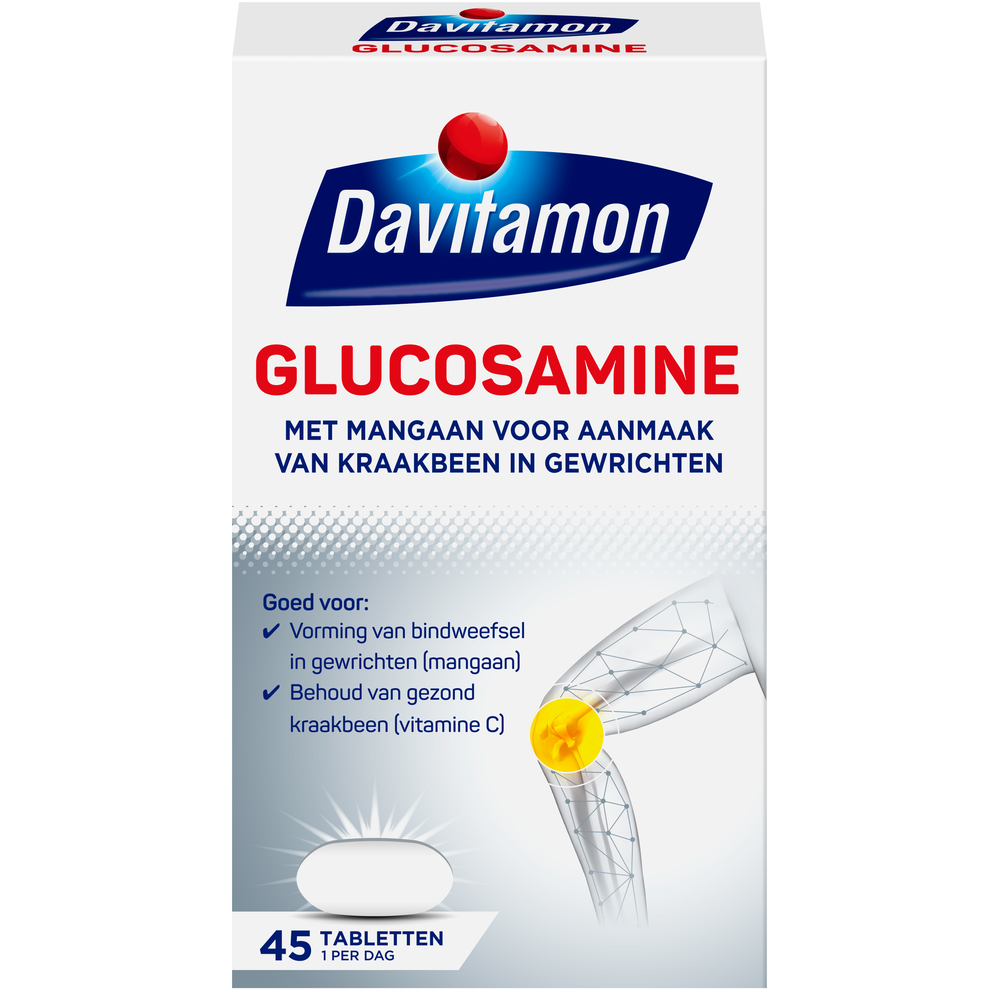 Davitamon Glucosamine Tabletten bevat 1500 mg glucosaminesulfaat, evenals mangaan en vitamine C. Vitamine C ondersteunt het behoud van gezond kraakbeen. Mangaan speelt een rol bij de normale opbouw van bindweefsel, zoals in knieën, heupen, ellebogen en vingers, en helpt