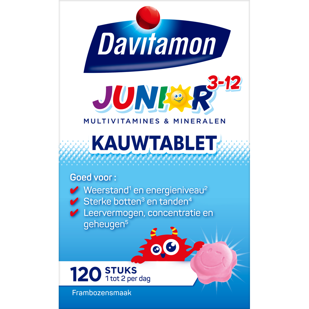Davitamon Junior 3+ Kauw Vitamines Framboos is een voedingssupplement speciaal ontwikkeld voor kinderen vanaf 3 jaar. Het bevat een uitgebalanceerde formule van vitamines en mineralen die zorgen voor een goede aanvulling op de voeding. De kauwtabletten hebben een