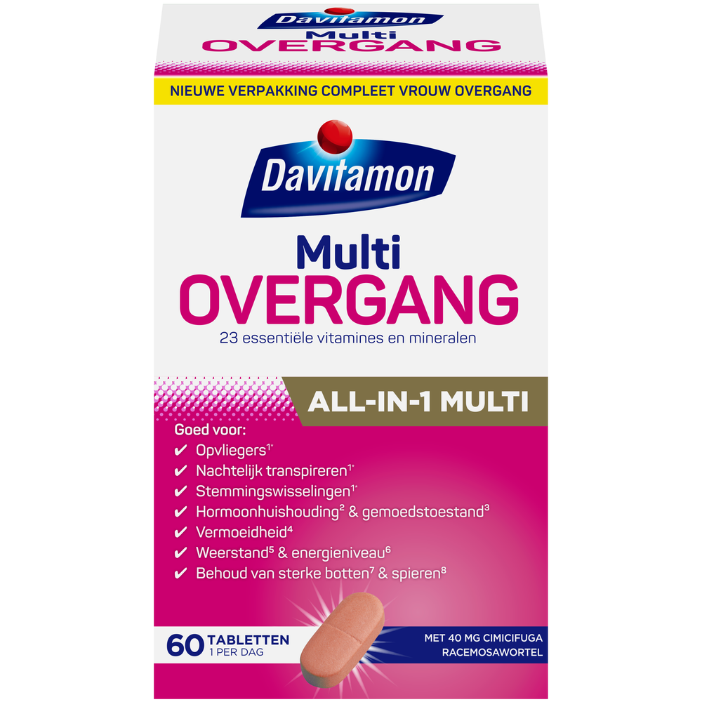 Davitamon Multi Overgang Tabletten (60 stuks) zijn speciaal ontwikkeld voor vrouwen in de overgang. Deze tabletten bevatten een combinatie van vitamines, mineralen en het natuurlijke extract Cimicifuga racemosa, die helpen bij overgangsverschijnselen en het behoud van een