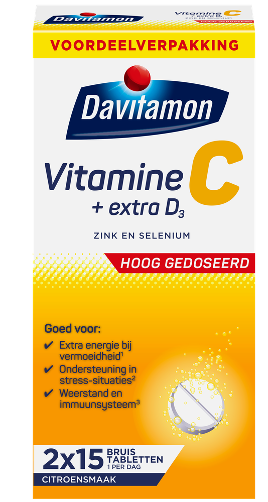 Davitamon Vitamine C + Extra D3 Bruistabletten (30 stuks) is een voedingssupplement met een hoge dosering vitamine C in combinatie met vitamine D3, selenium en zink. De handige bruisvorm zorgt voor een aangename opname van de vitamines en mineralen.Davitamon Vitamine C +