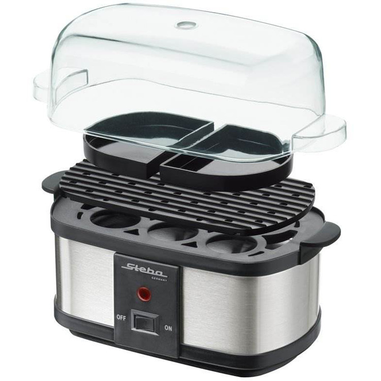 Unieke foodsteamer en eierkoker in één apparaat van roestvrij staal. Ideaal voor het koken van eieren (max. 6). Volautomatisch, met instelling voor het aantal eieren en de hardheid. Dankzij het bijgeleverde rekje eenvoudig te veranderen in een foodsteamer. Ideaal voor het stomen van diverse producten. Gezond koken met behoud van vitaminen! Met indicatielampje en geluidssignaal voor wanneer het einde van de kooktijd is bereikt.