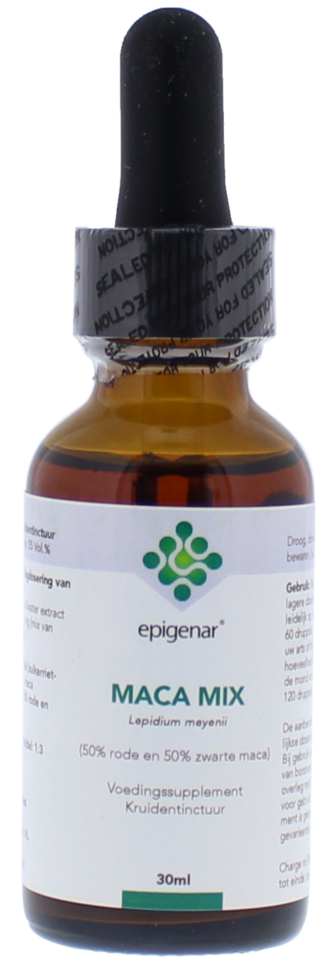 Epigenar Maca Mix Kruidentinctuur met maca (Lepidium meyenii) wortel (50% rode en 50% zwarte maca) uit Peru.De kruidentincturen van Epigenar worden voornamelijk bereid uit geselecteerde planten die eeuwenlang worden gebruikt door Indianen van Peru en Braziliƫ. Om