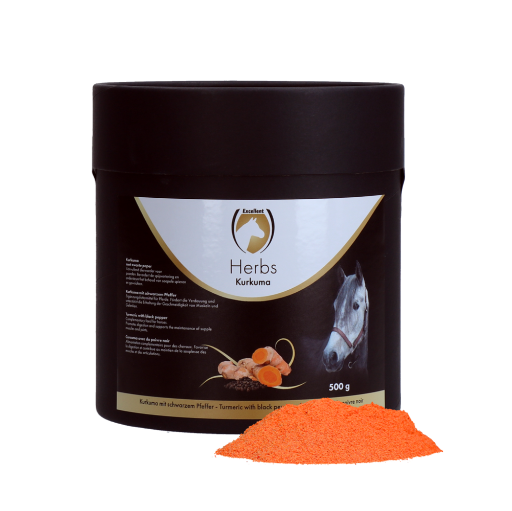 Excellent Herbs Kurkuma bestaat uit kurkuma met zwarte peper en is een aanvullend diervoeder voor paarden. Het bevordert de spijsvertering en ondersteunt het behoud van soepele spieren en gewrichten.