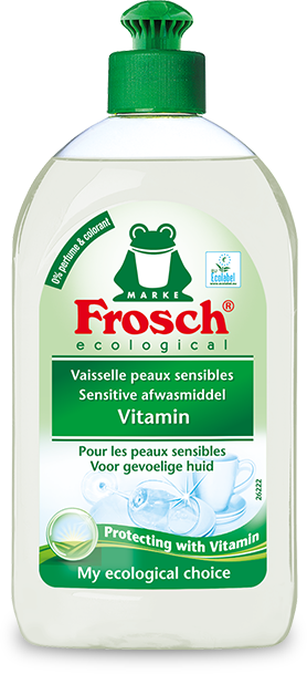 Frosch Afwasmiddel Sensitive Vitaminen wast moeiteloos uw vaat schoon en is vriendelijk voor het milieu en uw huid. Dit ecologische afwasmiddel is verrijkt met provitamine B5 voor bescherming tegen uitdroging van uw huid en de oppervlakteactieve stoffen van plantaardige