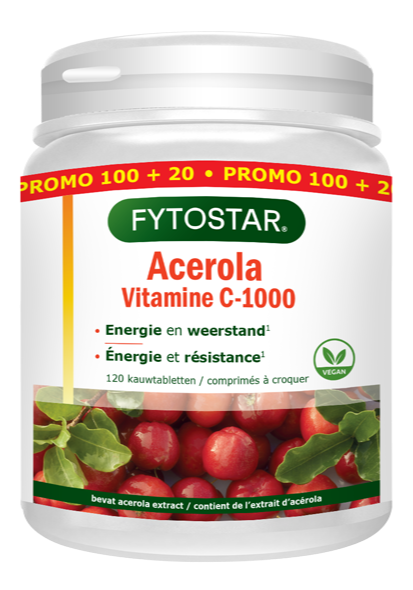 Fytostar Acerola Vitamine C-1000 Kauwabletten (120st) draagt bij tot de normale werking van het immuunsysteem en helpt de vermoeidheid verminderen. De bron voor de vitamine C in het vitamine C- en immuunsysteem supplement is onder andere acerola (West-Indische kers) en maïs.