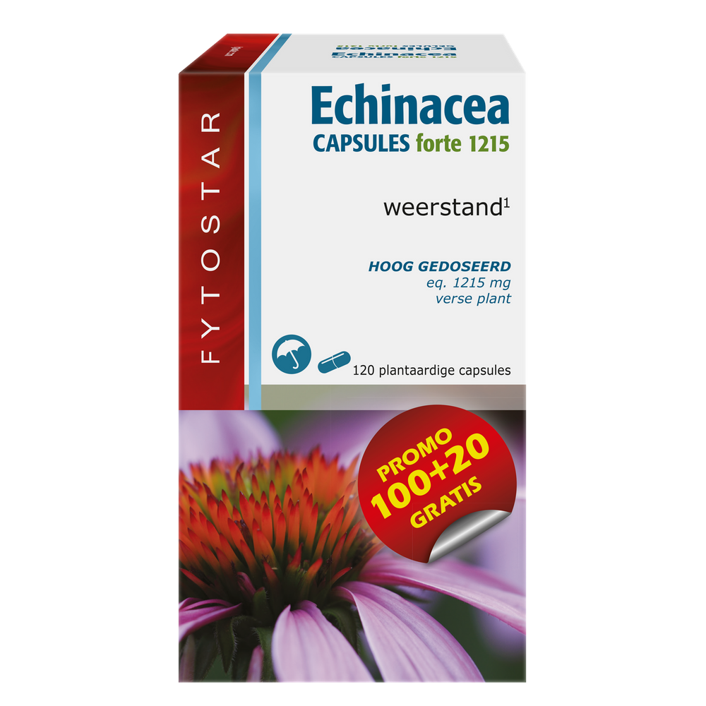 Fytostar Echinacea Forte 1215 bevat een concentraat van de wortel en het blad van Echinacea Purpurea die beide rijk zijn aan echinacosiden, onverzadigde vetzuren en fytosterolen. Echinacea heeft een ondersteunende werking op de immuniteit*en luchtwegen*.* Gezondheidsclaim in