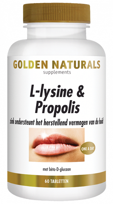 Golden Naturals L-lysine & Propolis is een voedingssupplement op basis van L-Lysine, aangevuld met andere ingrediënten waarvan vitamine C en zink de afweer van het lichaam ondersteunen. Bovendien ondersteunt zink het herstellend vermogen van de huid. Daarnaast bevat het