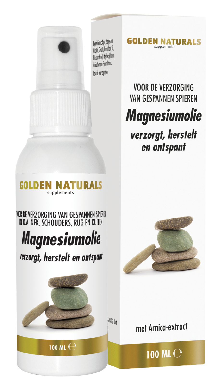 Golden Naturals Magnesiumolie Spray met 40% magnesiumchloride helpt uitwendig bij gespannen spieren in o.a. nek, schouders, rug en kuiten. Magnesium staat bekend om de herstellende werking op spierweefsel. Het toegevoegde arnica-extract helpt de spieren te ontspannen.Hoe te