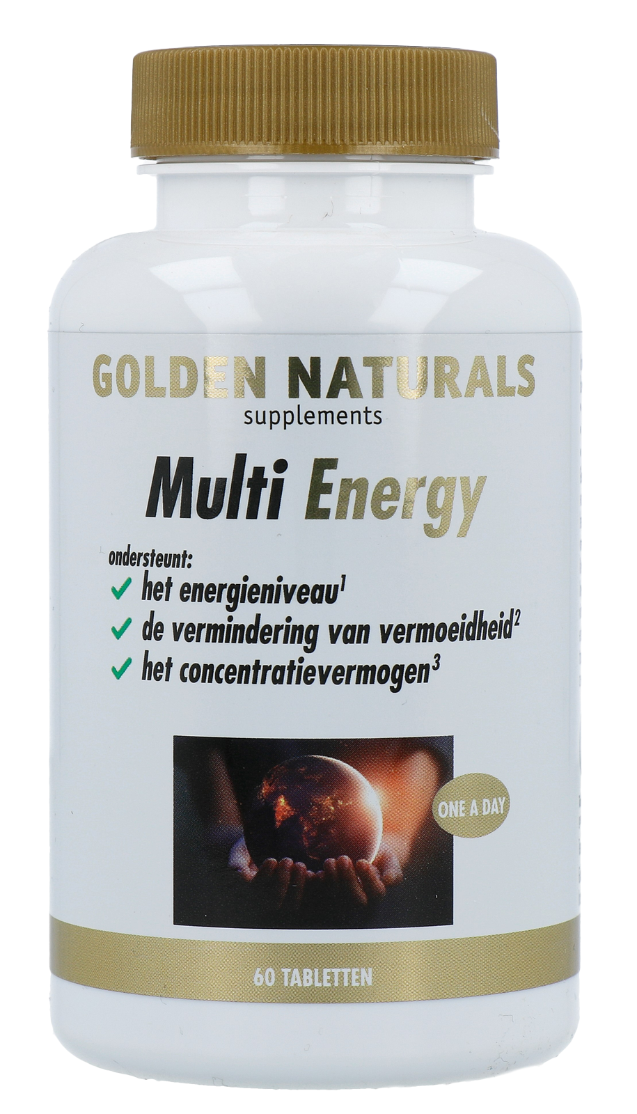 Golden Naturals Multi Energy Vega Tabletten (60 stuks) is een samenstelling van vitaminen, mineralen, kruidenextracten en andere nutriënten met specifieke aandacht voor het energieniveau. Een handige one a day-tablet met ijzer1, vitamine B122 en foliumzuur3 in bioactieve