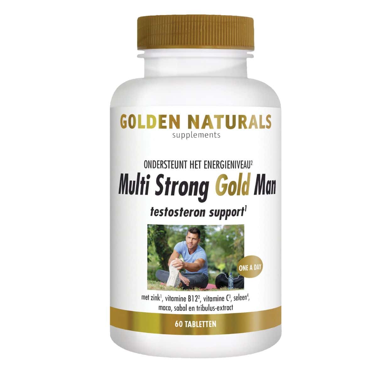 Golden Naturals Multi Man is een samenstelling van vitaminen, mineralen, kruidenextracten en andere nutriënten met specifieke aandacht voor de behoeften van de man. Een handige one a day-tablet met gepatenteerd zink (Albion Minerals®) dat de instandhouding van normale testosterongehalten in het bloed ondersteunt. Zink en seleen dragen bij tot een normale vruchtbaarheid en een goede spermakwaliteit. Uiteraard is het behoud van het energieniveau belangrijk, daarom bevat deze multi ook vitamine B12. Gebufferde vitamine C bevordert de weerstand tijdens en na fysieke inspanning. Aan deze ‘mannenmulti’ zijn ook nuttige nutriënten zoals maca, sabal en tribulus-extract toegevoegd.