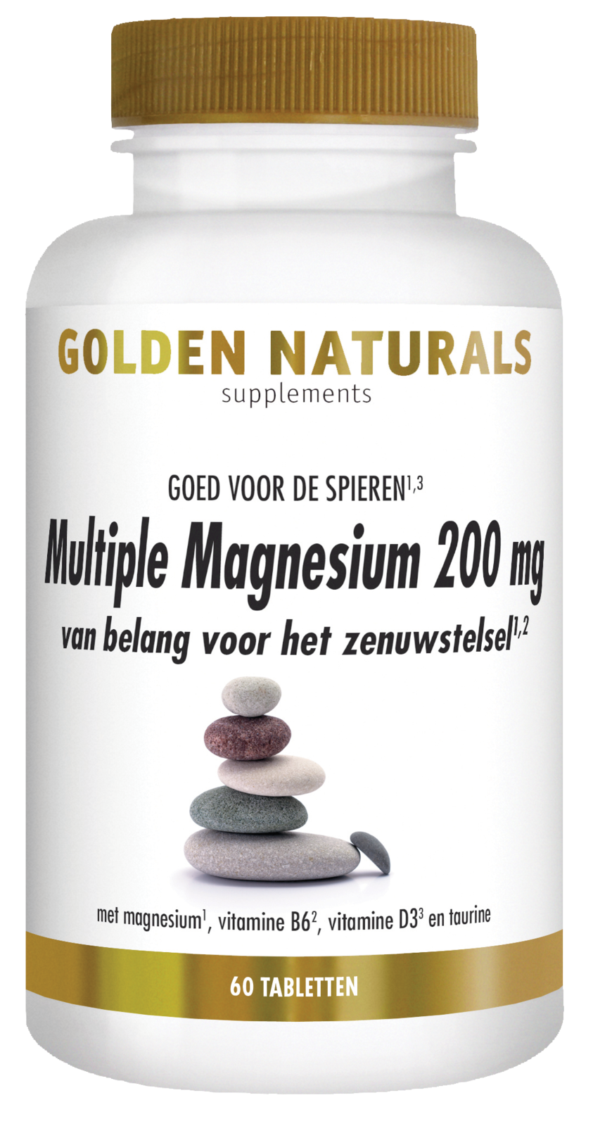 Golden Naturals Multiple Magnesium 200mg bevat een combinatie van vijf makkelijk opneembare magnesiumverbindingen in één tablet, waaronder magnesium citraat, magnesium bisglycinaat, magnesium tauraat, magnesium pidolaat en magnesium glycerofosfaat. Daarnaast zijn vitamine