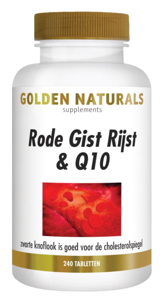 Golden Naturals Rode Gistrijst & Q10 Tabletten (240 stuks) is een voedingssupplement op basis van rode rijst en zwarte knoflook. Rode gist rijst is gefermenteerde witte rijst met de schimmel Monascus purpureus. Monacoline K wordt gevormd wanneer rijst fermenteert: een