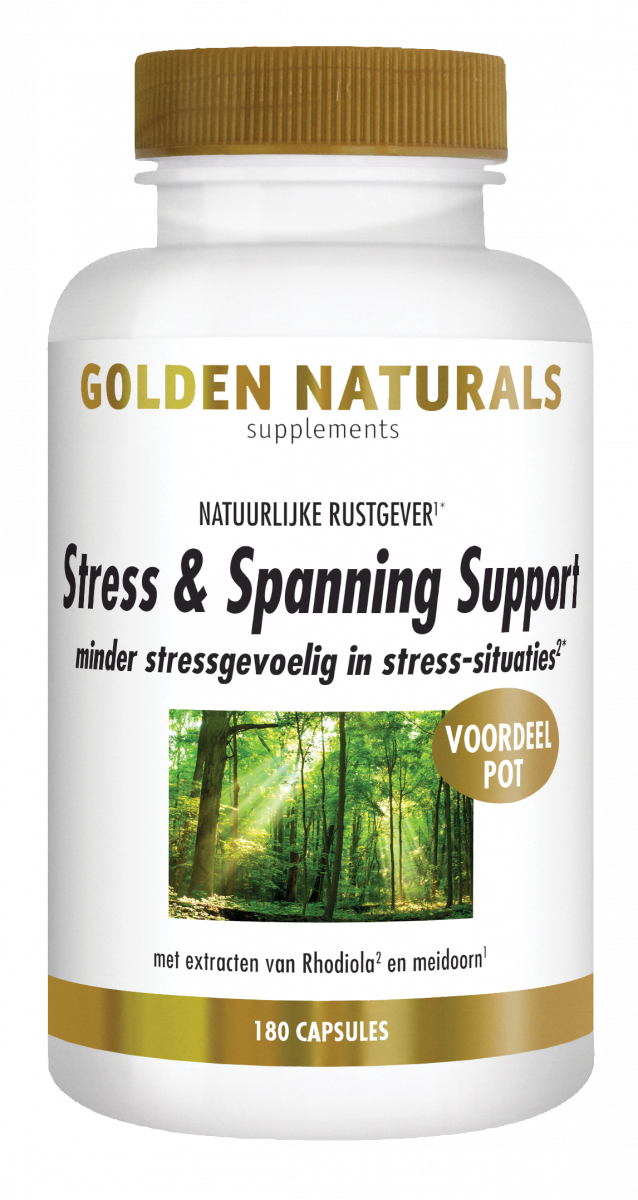 Golden Naturals Stress & Spanning Support is een voedingssupplement op basis van meidoorn dat een natuurlijke rustgever is*. Daarnaast bevat het rozewortel dat ervoor zorgt dat u minder stressgevoelig bent*. De toegevoegde magnesium heeft een ontspanning werking op de