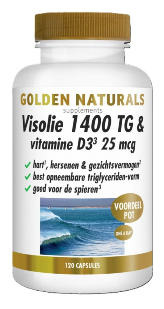 Golden Naturals Visolie 1400 TG & Vitamine D3 25mcg Capsules (120 stuks) is een vissupplement en bevat de omega-3 vetzuren EPA en DHA. DHA draagt bij tot de instandhouding van de normale hersenfunctie, EPA en DHA dragen bij tot de normale werking van het hart. Het gunstige