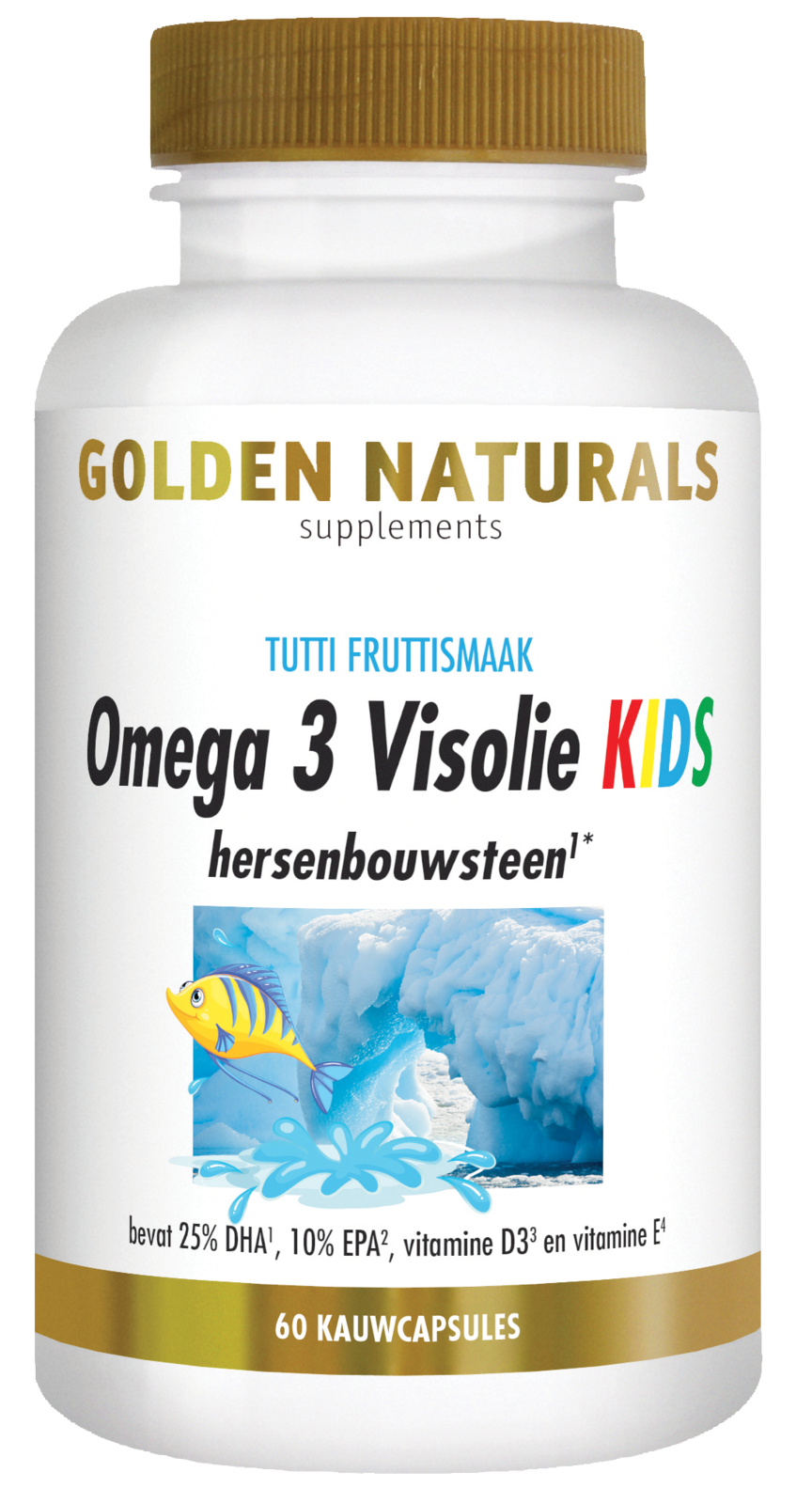 Golden Naturals Visolie KIDS Kauwcapsules is een voedingssupplement met zuivere, kwalitatieve visolie afkomstig van duurzaam gevangen tonijn, speciaal voor kinderen vanaf 1 jaar. Daarnaast bevat dit supplement vitamine D3 dat onder meer bijdraagt aan de normale groei en
