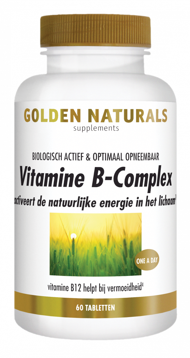 Golden Naturals Vitamine B-complex is een vitamine B-complex met B-vitaminen in bioactieve vorm. Het voordeel hiervan is dat deze niet eerst omgezet hoeven te worden alvorens werkzaam te kunnen zijn in de stofwisseling. Het zijn dus de lichaamseigen vormen en vaak ook de