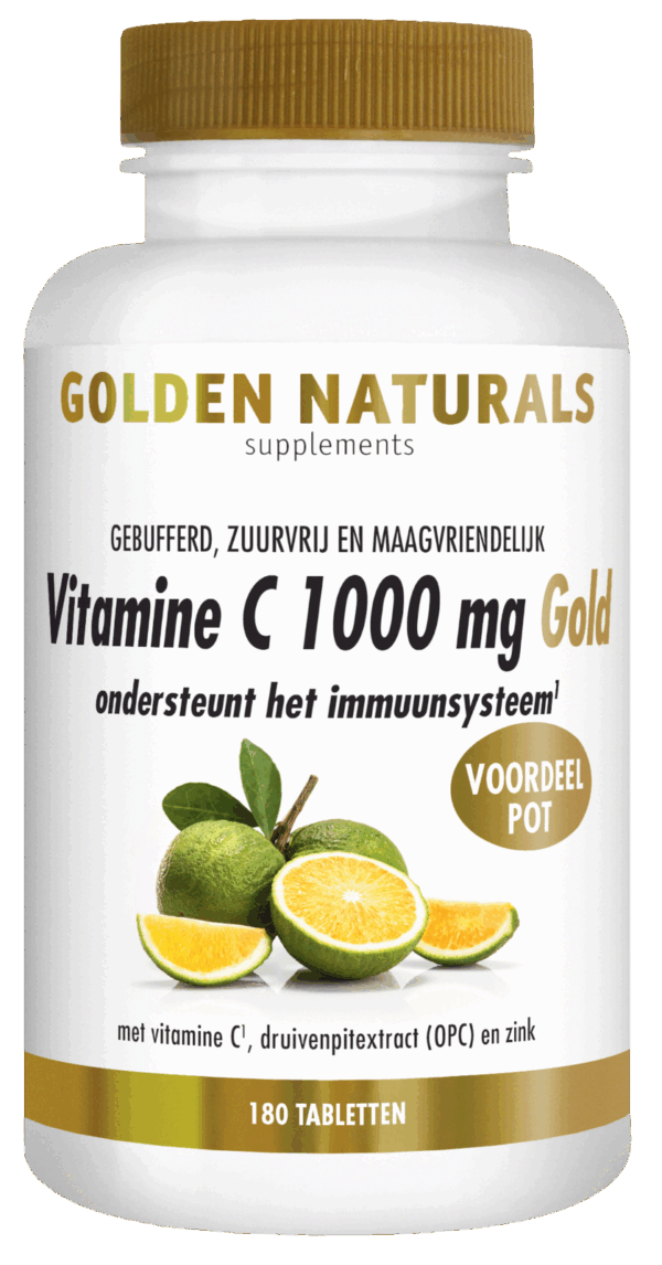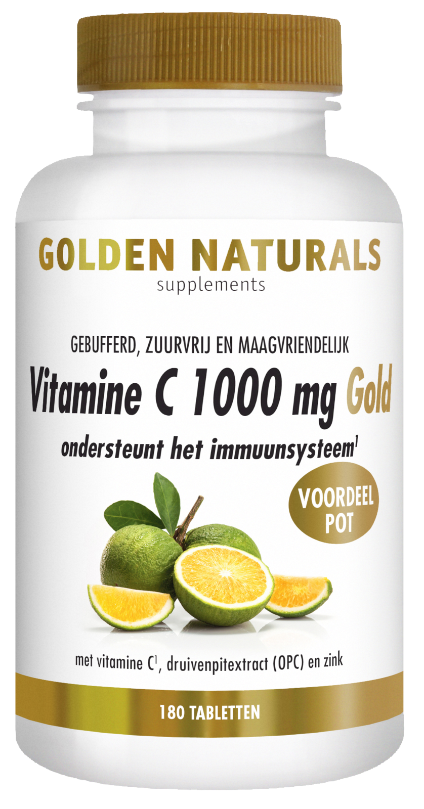 Golden Naturals Vitamine C 1000 mg Gold bevat vitamine C in de vorm van calcium- en magnesium-L-ascorbaat. Deze vorm wordt twee keer zo snel door het lichaam opgenomen en blijft maar liefst vier keer zo lang in het weefsel als een niet-gebufferde vitamine C. Dankzij de
