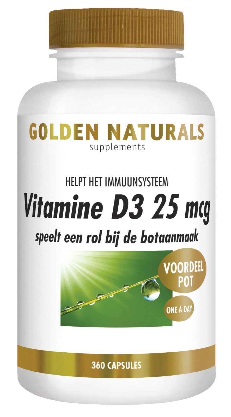 Golden Naturals Vitamine D3 25mcg Capsules met vitamine D3 gewonnen uit schapenwolvet, dragen bij aan een goede weerstand en gezonde spieren als aanvulling op de dagelijkse voeding. Tevens draagt dit voedingssupplement bij aan een gezonde botaanmaak. Omdat het lichaam zelf